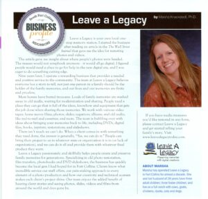 Leave A Legacy is your own local one-stop memory station. I started the business after reading an article in the Wall Street Journal that gave me the idea for restoring photos and videos.